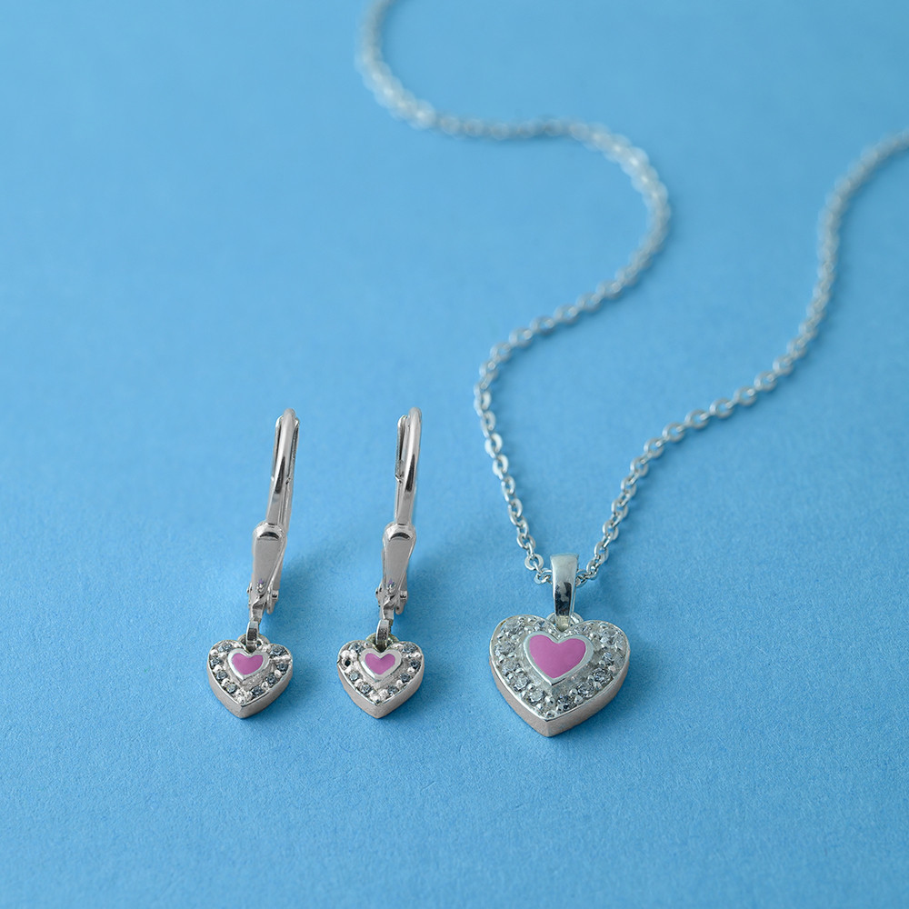 Něžné růžové srdíčko a ozdobný okraj stříbrného přívěsku na řetízku s náušnicemi potěší každou dívenku.