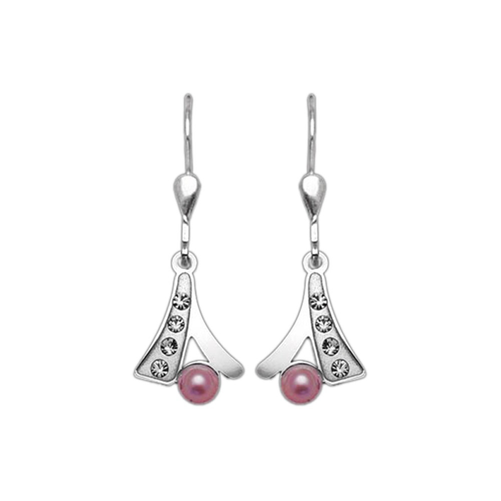 Něžné stříbrné náušnice doplněné řadou bílých kamínků a růžovým kabošovem potěší všechna srdce.