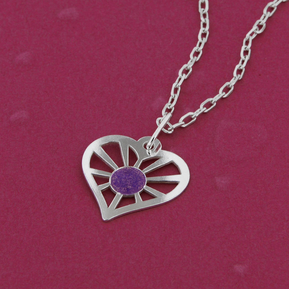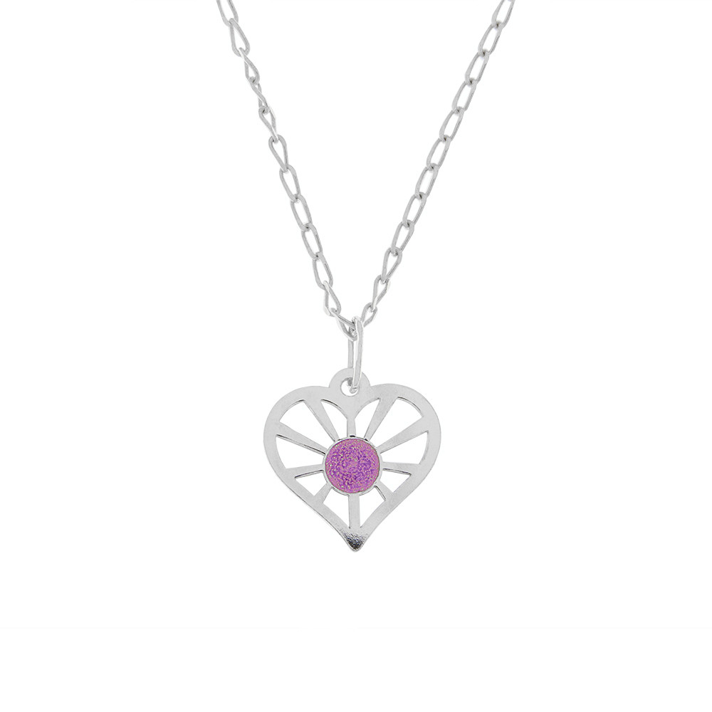 Stříbrné srdce z lásky darované, které zdobí něžný růžový střed, se houpe na stříbrném řetízku, se kterým tvoří komplet.