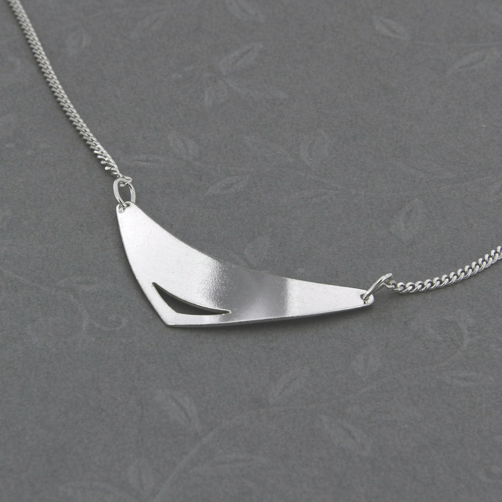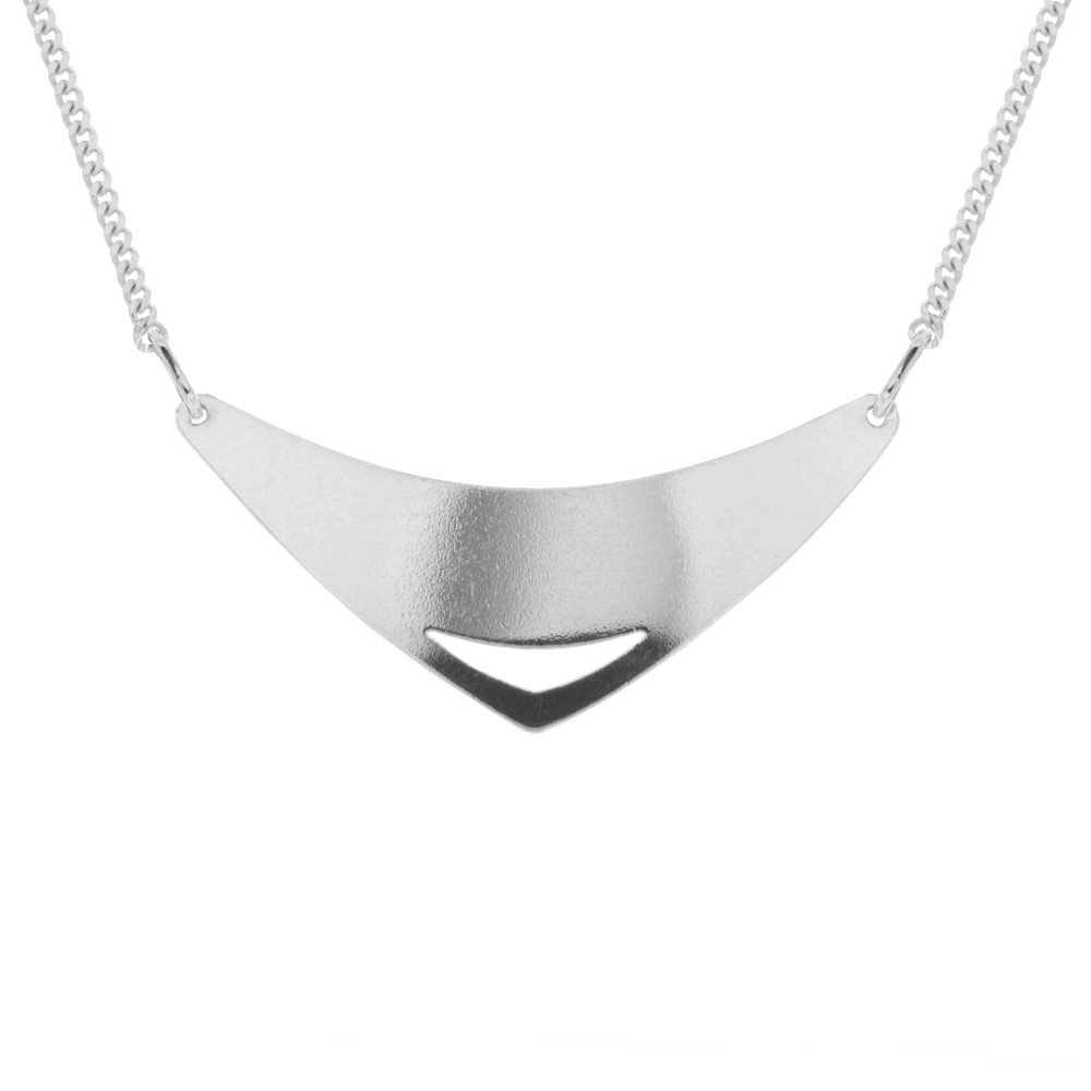 Elegantní ženě milující minimalismus osvěží oděv a podtrhne její osobitost jednoduchý stříbrný náhrdelník geometrického tvaru zavěšeného na řetízku.