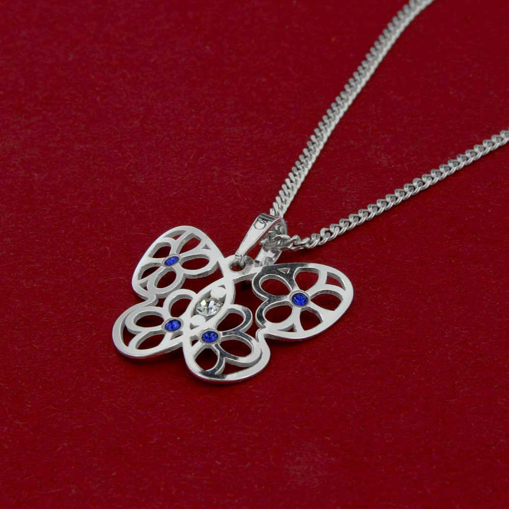 Lehká motýlí křídla ozdobená modrými kamínky a květinovým vzorem v podobě stříbrného přívěsku s řetízkem.