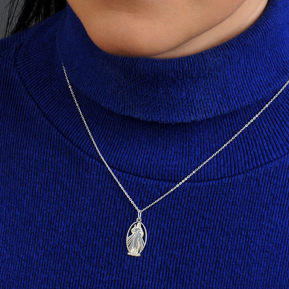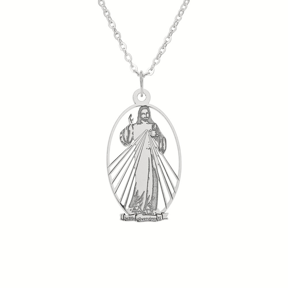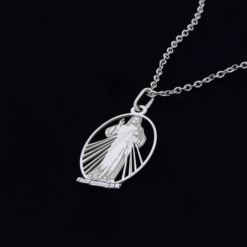 Obraz milosrdného Ježíše v jemném stříbrném přívěsku na řetízku připomíná důvěru a vroucnost, kterou vkládají křesťané do svých modliteb.