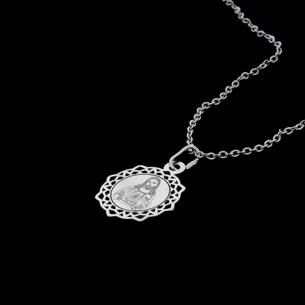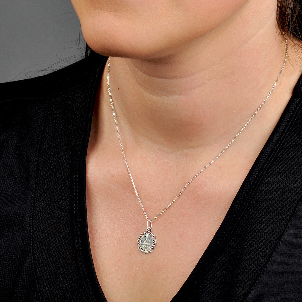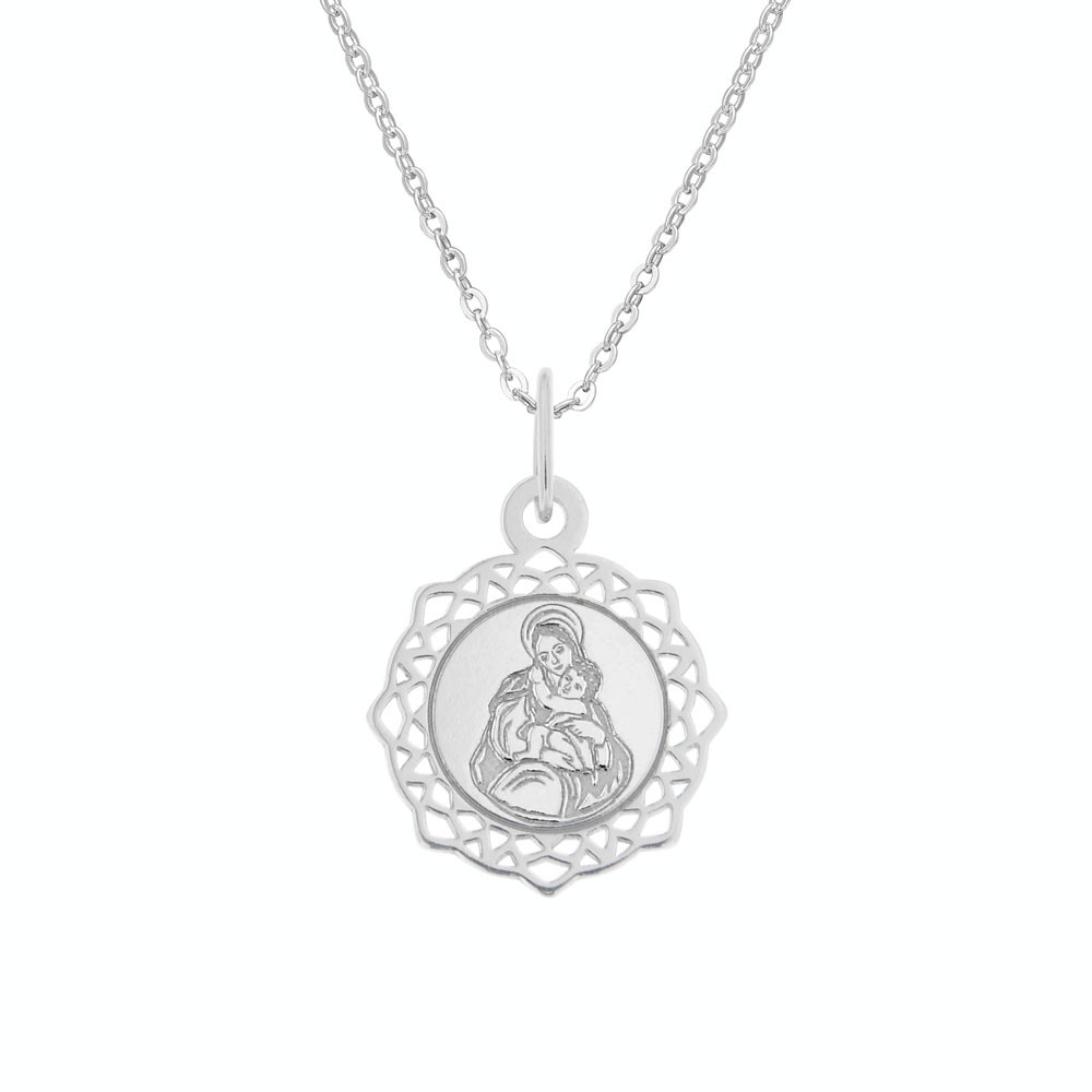 Láska Boží i hluboká láska mateřská jsou motivem něžného oboustranného stříbrného přívěsku na řetízku v krásně zdobeném rámu.