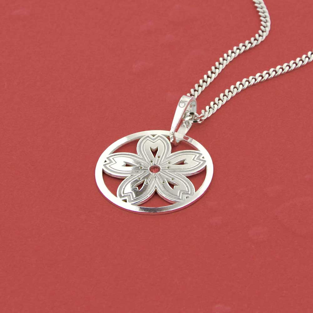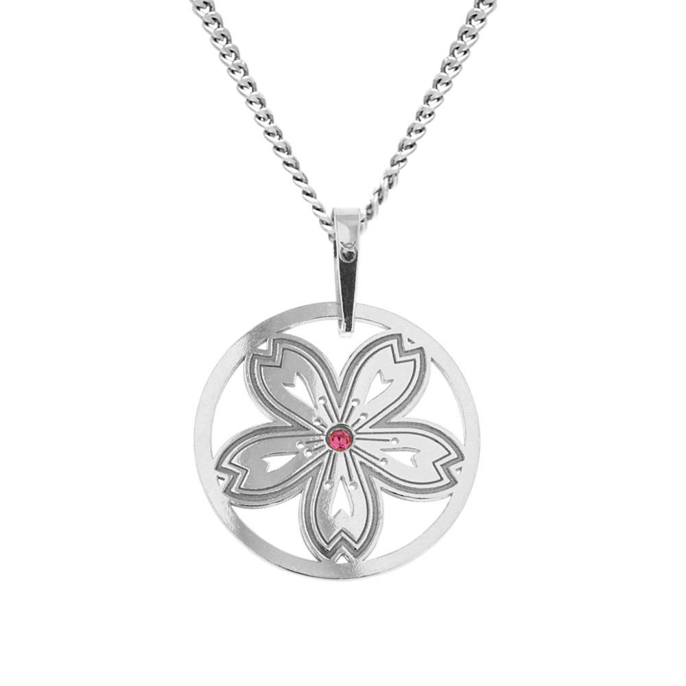 Na stříbrný řetízek jsme zavěsili půvabný stříbrný přívěsek představující jemnou květinu s pečlivě zpracovanými detaily a růžovým kamínkem uprostřed.
