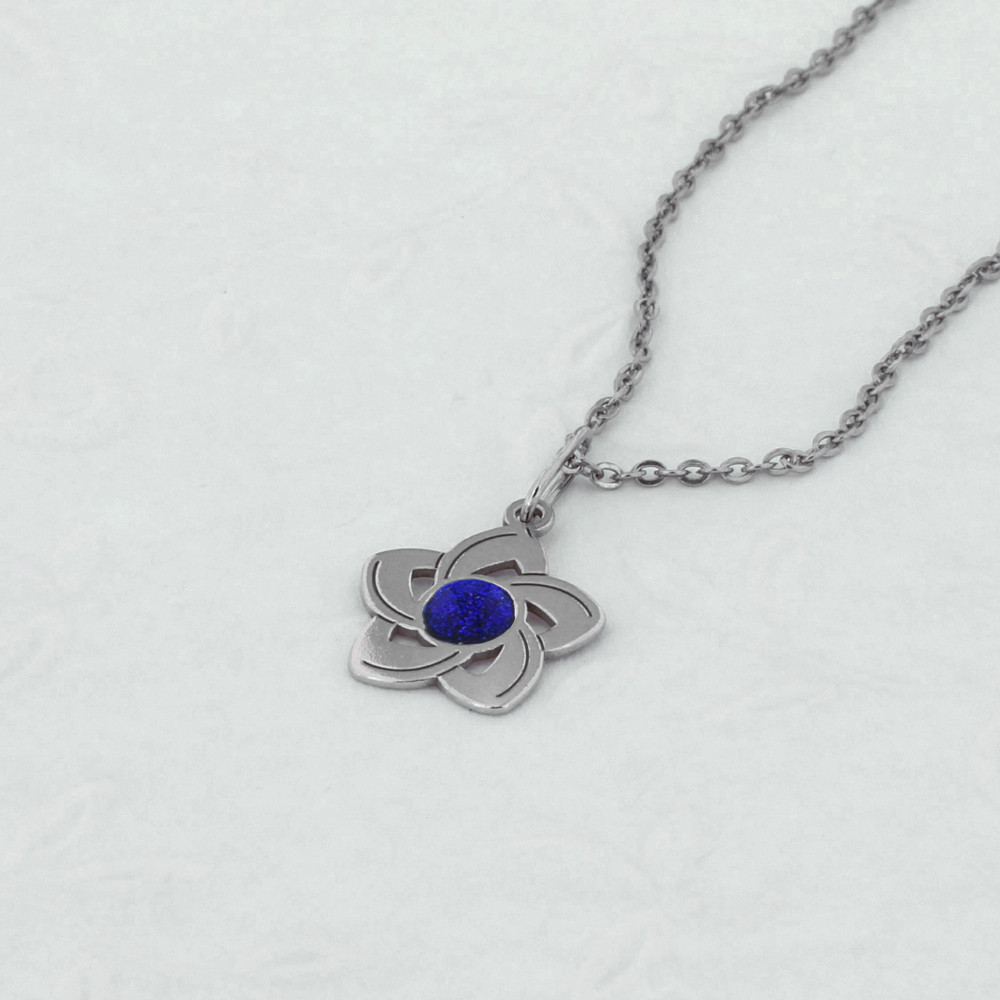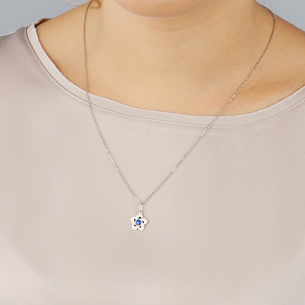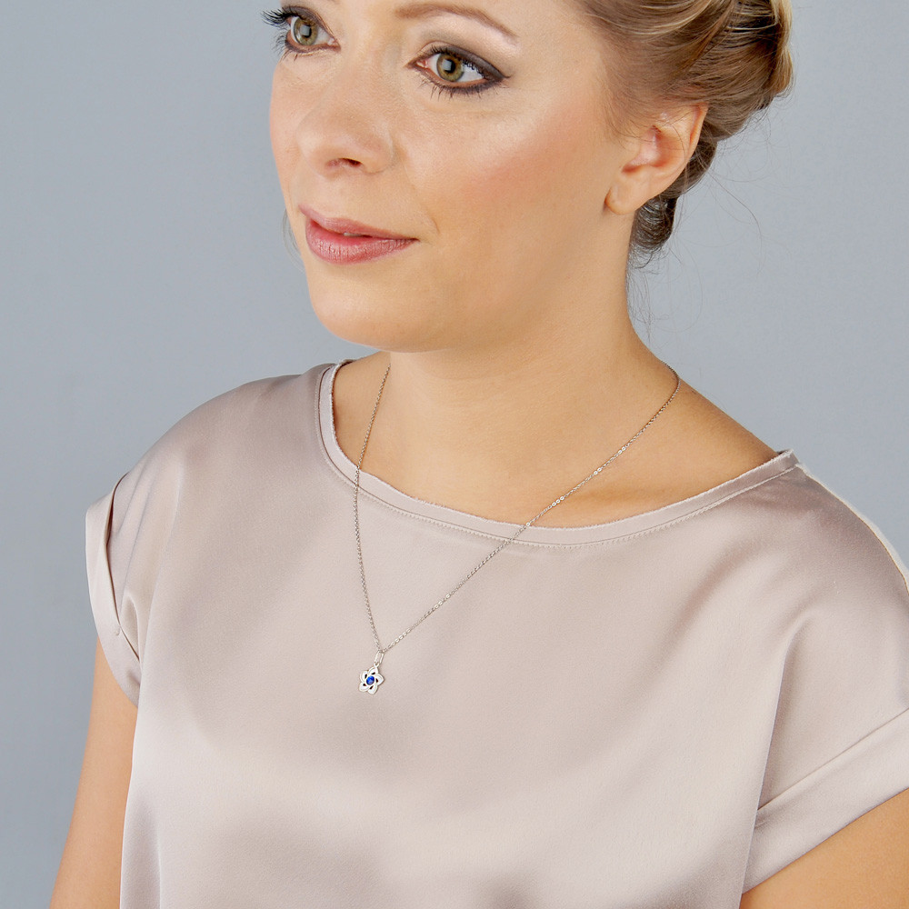 Modré nebe zrcadlící se v kapce rosy zmrzlé uprostřed ledového květu, to je tento něžný stříbrný přívěsek na řetízku prodloužené délky 49 cm. Šperk je opatřen ochranným rhodiováním.