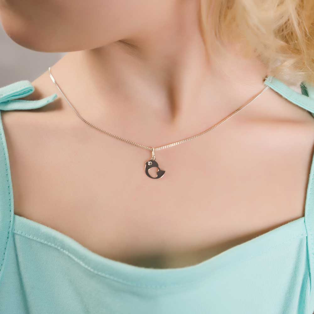 Lesklým očkem se na svět dívá ptáček, který nosí štěstí. Je vyroben ze stříbra a zavěšen na stříbrném řetízku.