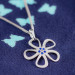 Jemný, a přesto výrazný přívěsek zobrazjící kvítek se středem z modrých kamínků na stříbrném řetízku.