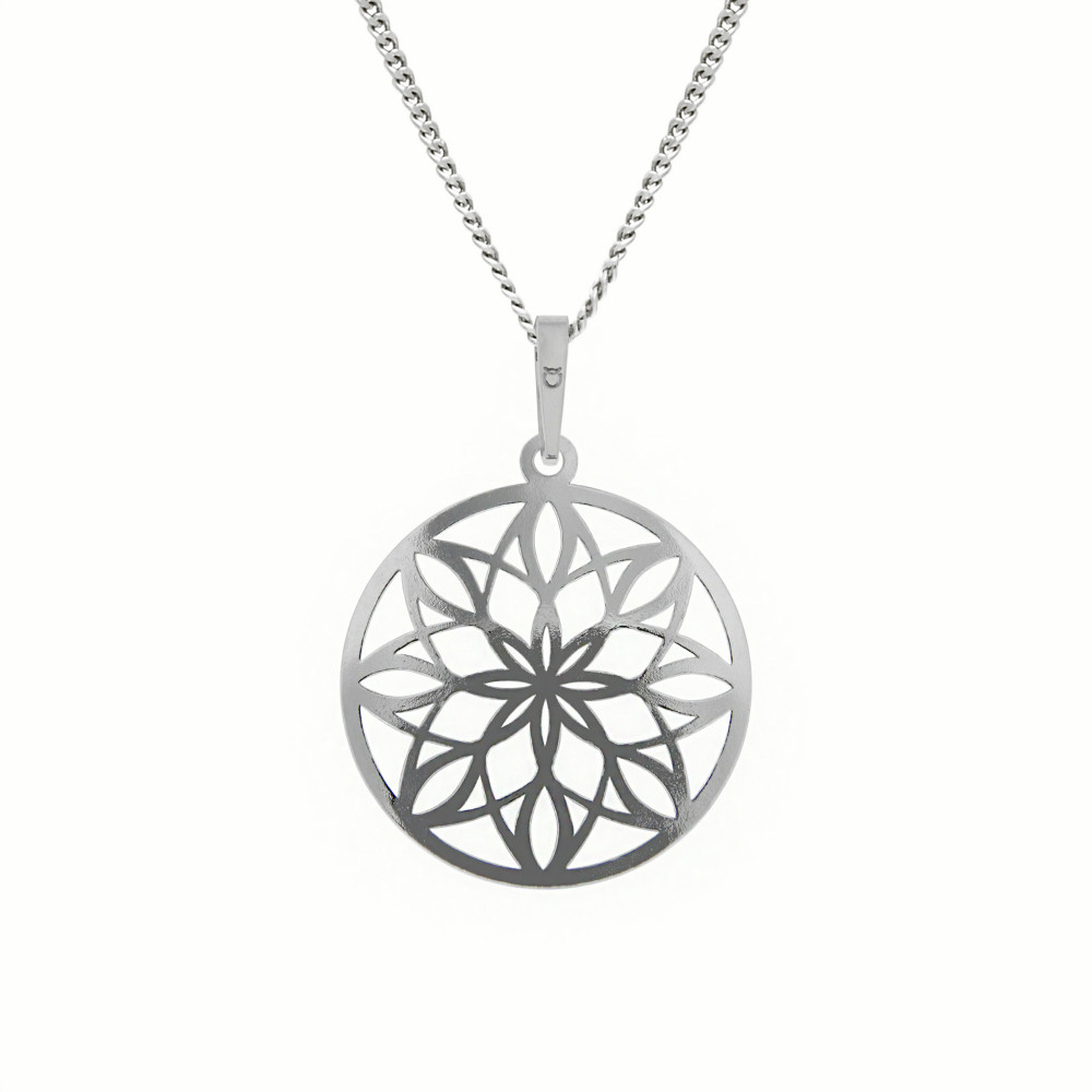 Půvabná stříbrná květina s proplétanými okvětními lístky v objetí pravidelného tvaru kruhového přívěsku, který je nabízen v kompletu se stříbrným řetízkem.