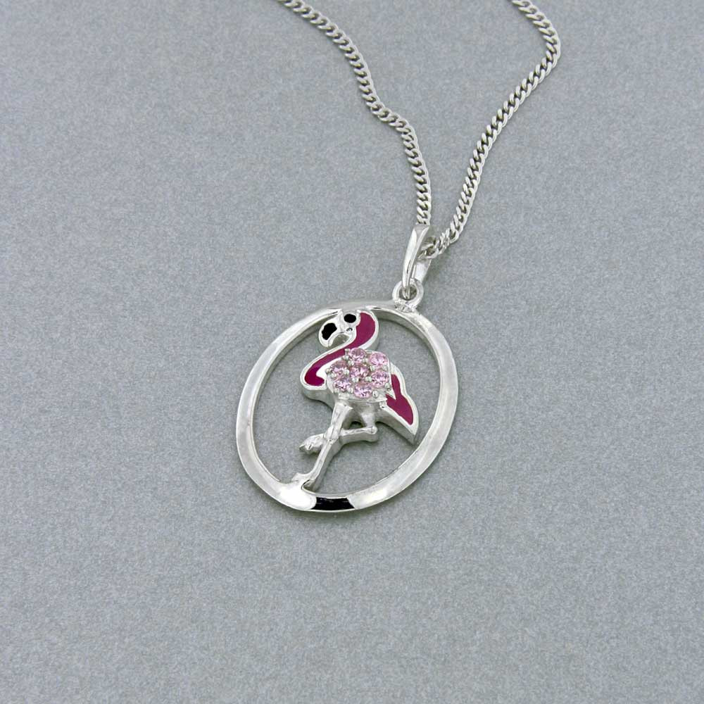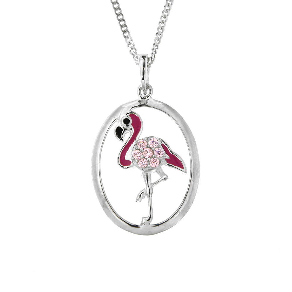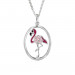 Do oválu stříbrného přívěsku na řetízku naskočil růžový plameňák, aby vám přinesl štěstí.