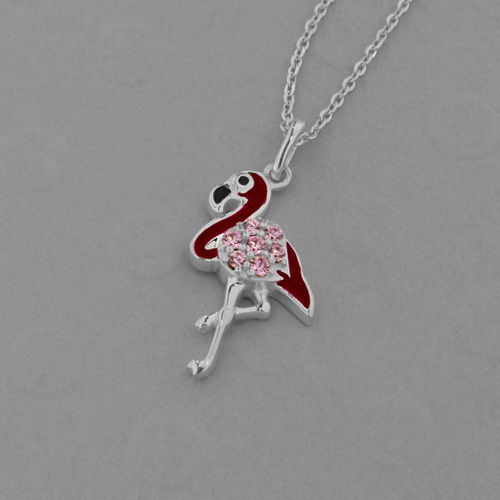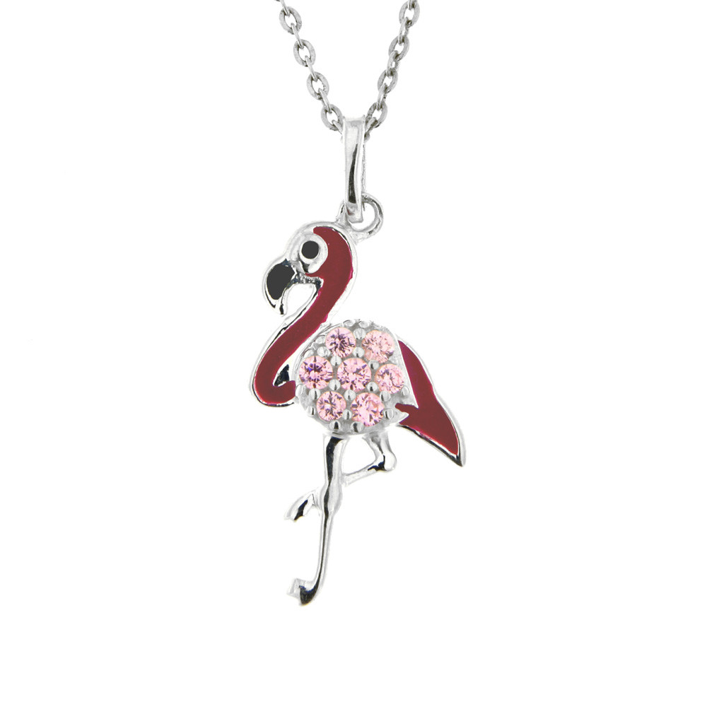 Každá holčička má ráda růžovou, a tak si zamiluje tohoto roztomilého plameňáka s kamínky v podobě stříbrného přívěsku na řetízku.