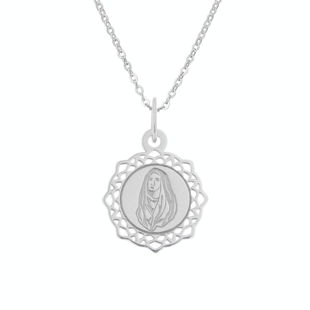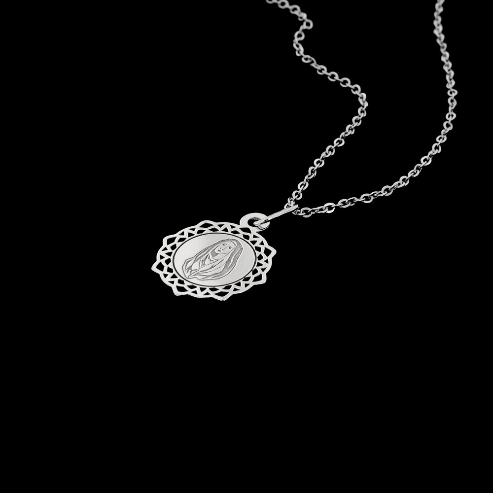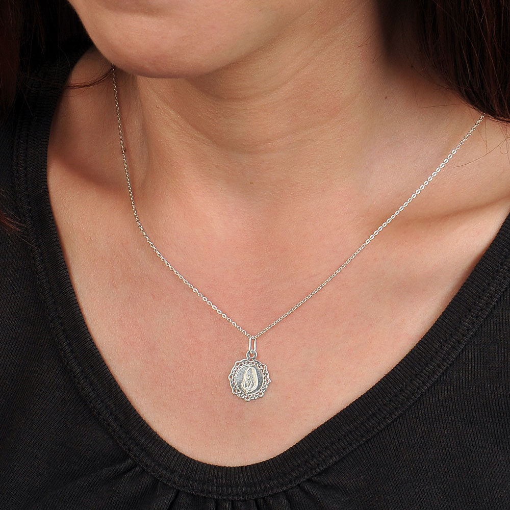 Smutek a naděje Panny Marie modlící se za vzkříšení syna jsou patrny na tomto křehkém stříbrném přívěsku na řetízku, jehož krásu podtrhuje jemně zdobený okraj.