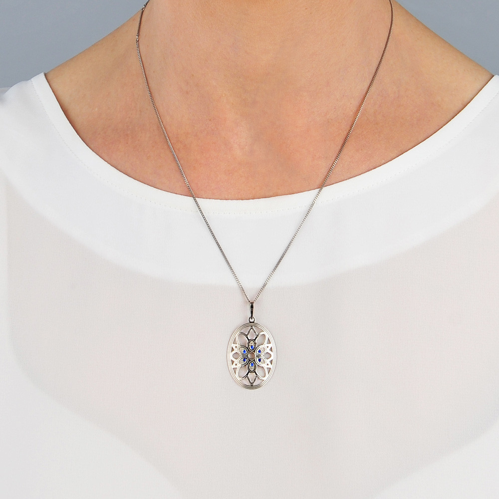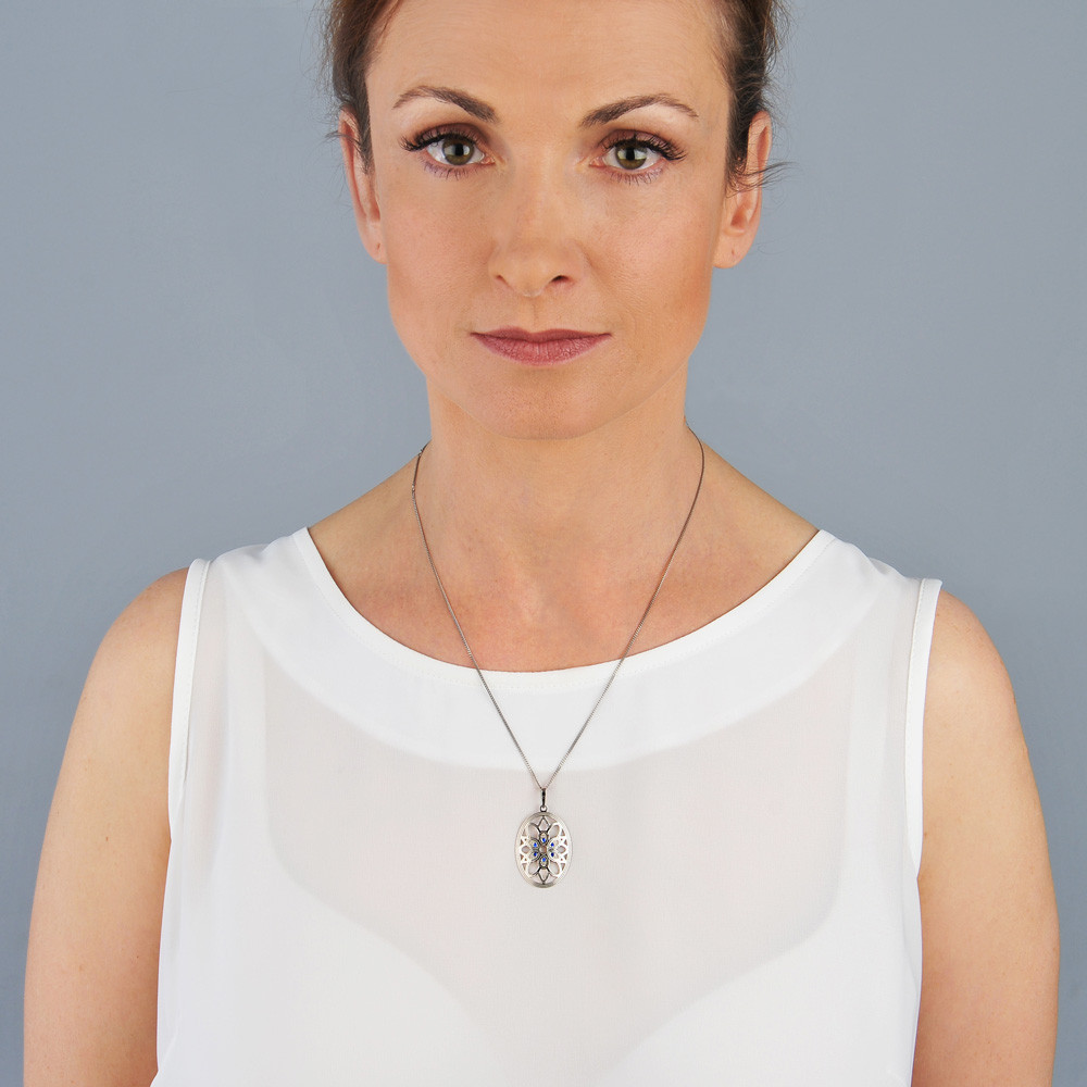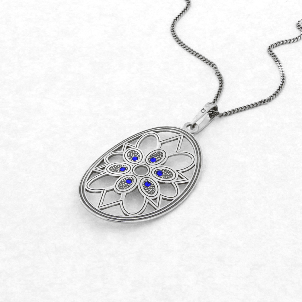 Stříbrný přívěsek s modrými kamínky na řetízku prodloužené délky 49 cm připomíná tradiční krásu jemných krajek. Šperk je opatřen ochranným rhodiováním.