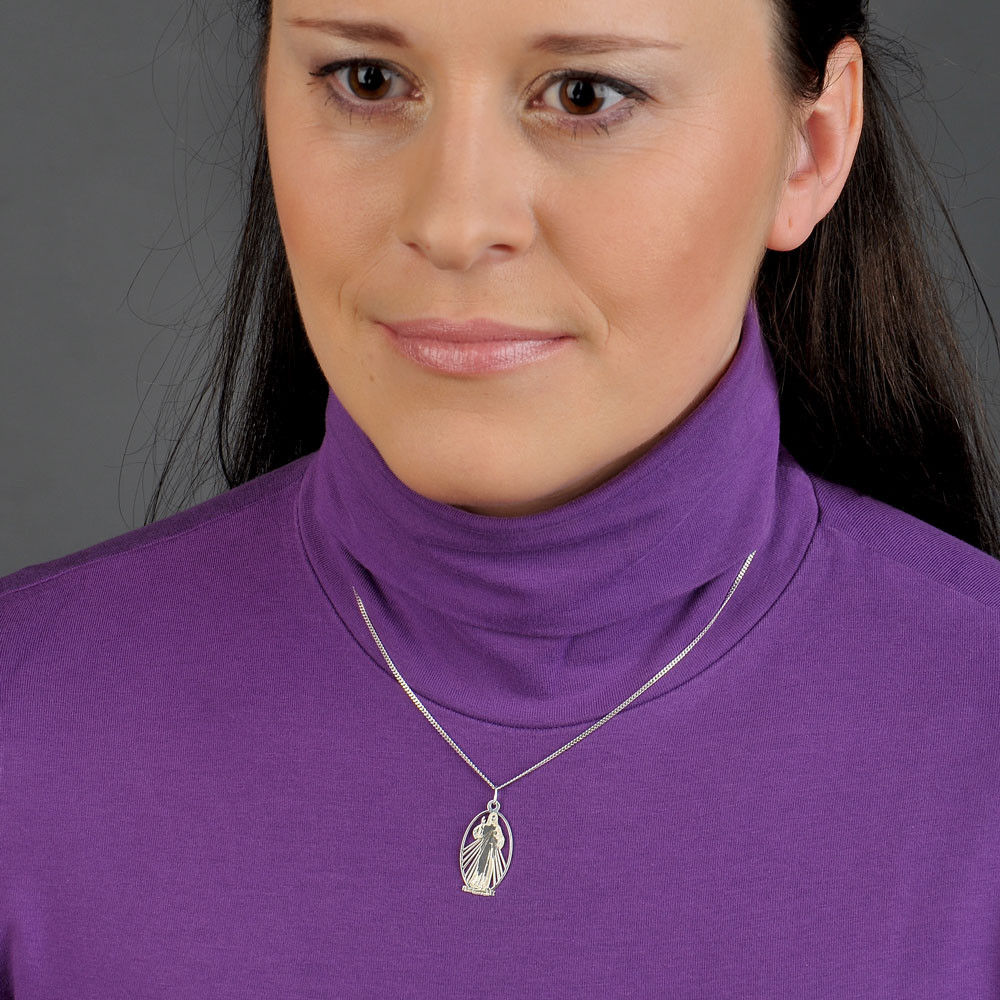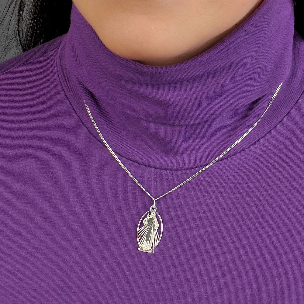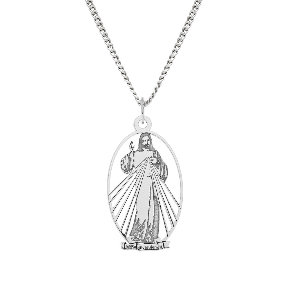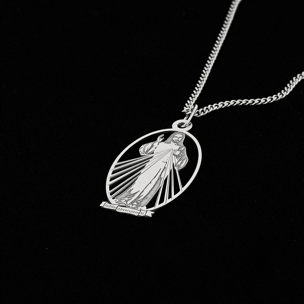 Stříbrný přívěsek na řetízku s obrazem milosrdného Ježíše vyjadřuje hluboký důvěrný vztah s Pánem. Paprsky z Ježíšových rukou jsou symbolem vody a krve, které vytryskly z jeho srdce probodeného na kříži. Voda, jež ospravedlňuje duše, a krev, která je jejich životem.