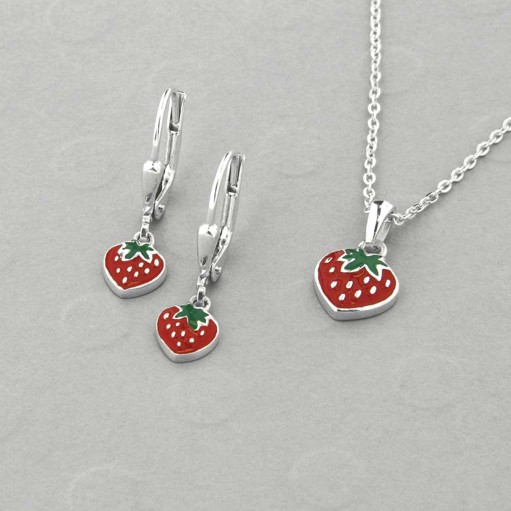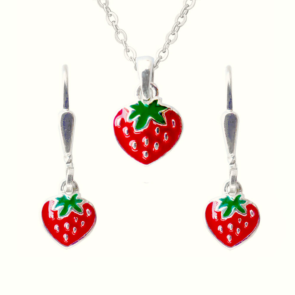 Barevný dětský stříbrný set tvořený náušnicemi a přívěskem houpajícím se na stříbrném řetízku voní létem a prázdninami jako skutečná zralá, červená jahoda z babiččiny zahrádky.